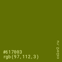 Цвет #617003 в цветовой модели RGB обозначается тремя октетами (97, 112, 3) в десятичном формате и #617003 в шестнадцатиричном (hex) формате, которые являются интенсивностью красного 97 (hex 61), интенсивность зелёного 112 (hex 70) и интенсивность синего 3 (hex 03).