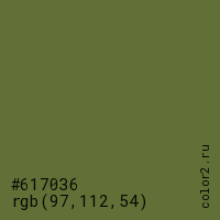Цвет #617036 в цветовой модели RGB обозначается тремя октетами (97, 112, 54) в десятичном формате и #617036 в шестнадцатиричном (hex) формате, которые являются интенсивностью красного 97 (hex 61), интенсивность зелёного 112 (hex 70) и интенсивность синего 54 (hex 36).