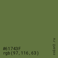 Цвет #61743F в цветовой модели RGB обозначается тремя октетами (97, 116, 63) в десятичном формате и #61743F в шестнадцатиричном (hex) формате, которые являются интенсивностью красного 97 (hex 61), интенсивность зелёного 116 (hex 74) и интенсивность синего 63 (hex 3F).