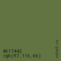 Цвет #617442 в цветовой модели RGB обозначается тремя октетами (97, 116, 66) в десятичном формате и #617442 в шестнадцатиричном (hex) формате, которые являются интенсивностью красного 97 (hex 61), интенсивность зелёного 116 (hex 74) и интенсивность синего 66 (hex 42).
