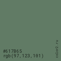 Цвет #617B65 в цветовой модели RGB обозначается тремя октетами (97, 123, 101) в десятичном формате и #617B65 в шестнадцатиричном (hex) формате, которые являются интенсивностью красного 97 (hex 61), интенсивность зелёного 123 (hex 7B) и интенсивность синего 101 (hex 65).