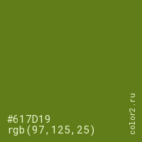 Цвет #617D19 в цветовой модели RGB обозначается тремя октетами (97, 125, 25) в десятичном формате и #617D19 в шестнадцатиричном (hex) формате, которые являются интенсивностью красного 97 (hex 61), интенсивность зелёного 125 (hex 7D) и интенсивность синего 25 (hex 19).