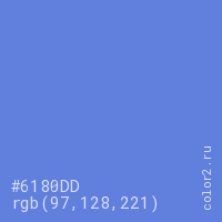 Цвет #6180DD в цветовой модели RGB обозначается тремя октетами (97, 128, 221) в десятичном формате и #6180DD в шестнадцатиричном (hex) формате, которые являются интенсивностью красного 97 (hex 61), интенсивность зелёного 128 (hex 80) и интенсивность синего 221 (hex DD).