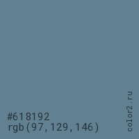 Цвет #618192 в цветовой модели RGB обозначается тремя октетами (97, 129, 146) в десятичном формате и #618192 в шестнадцатиричном (hex) формате, которые являются интенсивностью красного 97 (hex 61), интенсивность зелёного 129 (hex 81) и интенсивность синего 146 (hex 92).