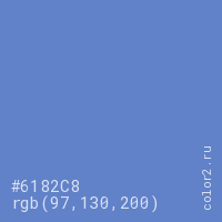 Цвет #6182C8 в цветовой модели RGB обозначается тремя октетами (97, 130, 200) в десятичном формате и #6182C8 в шестнадцатиричном (hex) формате, которые являются интенсивностью красного 97 (hex 61), интенсивность зелёного 130 (hex 82) и интенсивность синего 200 (hex C8).
