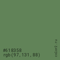 Цвет #618358 в цветовой модели RGB обозначается тремя октетами (97, 131, 88) в десятичном формате и #618358 в шестнадцатиричном (hex) формате, которые являются интенсивностью красного 97 (hex 61), интенсивность зелёного 131 (hex 83) и интенсивность синего 88 (hex 58).