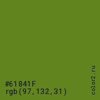 Цвет #61841F в цветовой модели RGB обозначается тремя октетами (97, 132, 31) в десятичном формате и #61841F в шестнадцатиричном (hex) формате, которые являются интенсивностью красного 97 (hex 61), интенсивность зелёного 132 (hex 84) и интенсивность синего 31 (hex 1F).