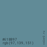 Цвет #618B97 в цветовой модели RGB обозначается тремя октетами (97, 139, 151) в десятичном формате и #618B97 в шестнадцатиричном (hex) формате, которые являются интенсивностью красного 97 (hex 61), интенсивность зелёного 139 (hex 8B) и интенсивность синего 151 (hex 97).