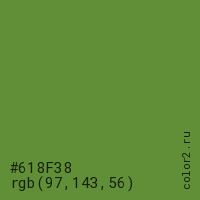 Цвет #618F38 в цветовой модели RGB обозначается тремя октетами (97, 143, 56) в десятичном формате и #618F38 в шестнадцатиричном (hex) формате, которые являются интенсивностью красного 97 (hex 61), интенсивность зелёного 143 (hex 8F) и интенсивность синего 56 (hex 38).