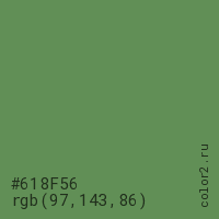 Цвет #618F56 в цветовой модели RGB обозначается тремя октетами (97, 143, 86) в десятичном формате и #618F56 в шестнадцатиричном (hex) формате, которые являются интенсивностью красного 97 (hex 61), интенсивность зелёного 143 (hex 8F) и интенсивность синего 86 (hex 56).