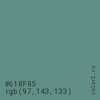 Цвет #618F85 в цветовой модели RGB обозначается тремя октетами (97, 143, 133) в десятичном формате и #618F85 в шестнадцатиричном (hex) формате, которые являются интенсивностью красного 97 (hex 61), интенсивность зелёного 143 (hex 8F) и интенсивность синего 133 (hex 85).