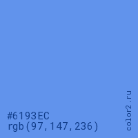 Цвет #6193EC в цветовой модели RGB обозначается тремя октетами (97, 147, 236) в десятичном формате и #6193EC в шестнадцатиричном (hex) формате, которые являются интенсивностью красного 97 (hex 61), интенсивность зелёного 147 (hex 93) и интенсивность синего 236 (hex EC).