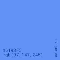 Цвет #6193F5 в цветовой модели RGB обозначается тремя октетами (97, 147, 245) в десятичном формате и #6193F5 в шестнадцатиричном (hex) формате, которые являются интенсивностью красного 97 (hex 61), интенсивность зелёного 147 (hex 93) и интенсивность синего 245 (hex F5).