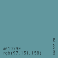 Цвет #61979E в цветовой модели RGB обозначается тремя октетами (97, 151, 158) в десятичном формате и #61979E в шестнадцатиричном (hex) формате, которые являются интенсивностью красного 97 (hex 61), интенсивность зелёного 151 (hex 97) и интенсивность синего 158 (hex 9E).