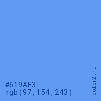 Цвет #619AF3 в цветовой модели RGB обозначается тремя октетами (97, 154, 243) в десятичном формате и #619AF3 в шестнадцатиричном (hex) формате, которые являются интенсивностью красного 97 (hex 61), интенсивность зелёного 154 (hex 9A) и интенсивность синего 243 (hex F3).