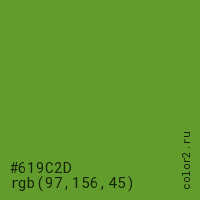 Цвет #619C2D в цветовой модели RGB обозначается тремя октетами (97, 156, 45) в десятичном формате и #619C2D в шестнадцатиричном (hex) формате, которые являются интенсивностью красного 97 (hex 61), интенсивность зелёного 156 (hex 9C) и интенсивность синего 45 (hex 2D).