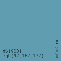 Цвет #619DB1 в цветовой модели RGB обозначается тремя октетами (97, 157, 177) в десятичном формате и #619DB1 в шестнадцатиричном (hex) формате, которые являются интенсивностью красного 97 (hex 61), интенсивность зелёного 157 (hex 9D) и интенсивность синего 177 (hex B1).
