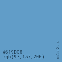 Цвет #619DC8 в цветовой модели RGB обозначается тремя октетами (97, 157, 200) в десятичном формате и #619DC8 в шестнадцатиричном (hex) формате, которые являются интенсивностью красного 97 (hex 61), интенсивность зелёного 157 (hex 9D) и интенсивность синего 200 (hex C8).