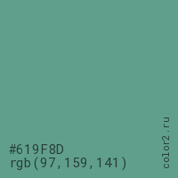 Цвет #619F8D в цветовой модели RGB обозначается тремя октетами (97, 159, 141) в десятичном формате и #619F8D в шестнадцатиричном (hex) формате, которые являются интенсивностью красного 97 (hex 61), интенсивность зелёного 159 (hex 9F) и интенсивность синего 141 (hex 8D).
