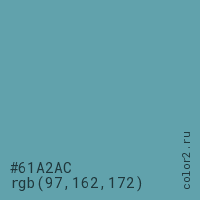 Цвет #61A2AC в цветовой модели RGB обозначается тремя октетами (97, 162, 172) в десятичном формате и #61A2AC в шестнадцатиричном (hex) формате, которые являются интенсивностью красного 97 (hex 61), интенсивность зелёного 162 (hex A2) и интенсивность синего 172 (hex AC).