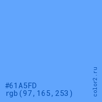 Цвет #61A5FD в цветовой модели RGB обозначается тремя октетами (97, 165, 253) в десятичном формате и #61A5FD в шестнадцатиричном (hex) формате, которые являются интенсивностью красного 97 (hex 61), интенсивность зелёного 165 (hex A5) и интенсивность синего 253 (hex FD).