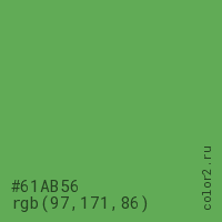 Цвет #61AB56 в цветовой модели RGB обозначается тремя октетами (97, 171, 86) в десятичном формате и #61AB56 в шестнадцатиричном (hex) формате, которые являются интенсивностью красного 97 (hex 61), интенсивность зелёного 171 (hex AB) и интенсивность синего 86 (hex 56).
