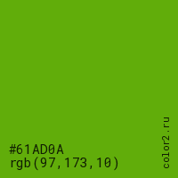 Цвет #61AD0A в цветовой модели RGB обозначается тремя октетами (97, 173, 10) в десятичном формате и #61AD0A в шестнадцатиричном (hex) формате, которые являются интенсивностью красного 97 (hex 61), интенсивность зелёного 173 (hex AD) и интенсивность синего 10 (hex 0A).