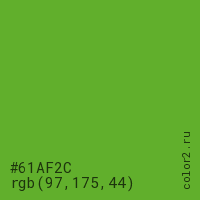 Цвет #61AF2C в цветовой модели RGB обозначается тремя октетами (97, 175, 44) в десятичном формате и #61AF2C в шестнадцатиричном (hex) формате, которые являются интенсивностью красного 97 (hex 61), интенсивность зелёного 175 (hex AF) и интенсивность синего 44 (hex 2C).
