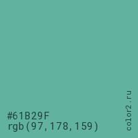 Цвет #61B29F в цветовой модели RGB обозначается тремя октетами (97, 178, 159) в десятичном формате и #61B29F в шестнадцатиричном (hex) формате, которые являются интенсивностью красного 97 (hex 61), интенсивность зелёного 178 (hex B2) и интенсивность синего 159 (hex 9F).