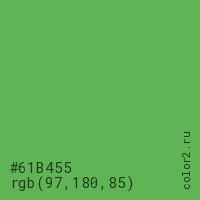 Цвет #61B455 в цветовой модели RGB обозначается тремя октетами (97, 180, 85) в десятичном формате и #61B455 в шестнадцатиричном (hex) формате, которые являются интенсивностью красного 97 (hex 61), интенсивность зелёного 180 (hex B4) и интенсивность синего 85 (hex 55).