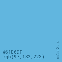 Цвет #61B6DF в цветовой модели RGB обозначается тремя октетами (97, 182, 223) в десятичном формате и #61B6DF в шестнадцатиричном (hex) формате, которые являются интенсивностью красного 97 (hex 61), интенсивность зелёного 182 (hex B6) и интенсивность синего 223 (hex DF).