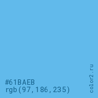 Цвет #61BAEB в цветовой модели RGB обозначается тремя октетами (97, 186, 235) в десятичном формате и #61BAEB в шестнадцатиричном (hex) формате, которые являются интенсивностью красного 97 (hex 61), интенсивность зелёного 186 (hex BA) и интенсивность синего 235 (hex EB).