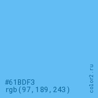 Цвет #61BDF3 в цветовой модели RGB обозначается тремя октетами (97, 189, 243) в десятичном формате и #61BDF3 в шестнадцатиричном (hex) формате, которые являются интенсивностью красного 97 (hex 61), интенсивность зелёного 189 (hex BD) и интенсивность синего 243 (hex F3).