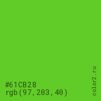 Цвет #61CB28 в цветовой модели RGB обозначается тремя октетами (97, 203, 40) в десятичном формате и #61CB28 в шестнадцатиричном (hex) формате, которые являются интенсивностью красного 97 (hex 61), интенсивность зелёного 203 (hex CB) и интенсивность синего 40 (hex 28).