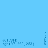 Цвет #61CBFD в цветовой модели RGB обозначается тремя октетами (97, 203, 253) в десятичном формате и #61CBFD в шестнадцатиричном (hex) формате, которые являются интенсивностью красного 97 (hex 61), интенсивность зелёного 203 (hex CB) и интенсивность синего 253 (hex FD).