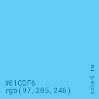 Цвет #61CDF6 в цветовой модели RGB обозначается тремя октетами (97, 205, 246) в десятичном формате и #61CDF6 в шестнадцатиричном (hex) формате, которые являются интенсивностью красного 97 (hex 61), интенсивность зелёного 205 (hex CD) и интенсивность синего 246 (hex F6).