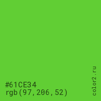 Цвет #61CE34 в цветовой модели RGB обозначается тремя октетами (97, 206, 52) в десятичном формате и #61CE34 в шестнадцатиричном (hex) формате, которые являются интенсивностью красного 97 (hex 61), интенсивность зелёного 206 (hex CE) и интенсивность синего 52 (hex 34).