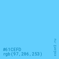 Цвет #61CEFD в цветовой модели RGB обозначается тремя октетами (97, 206, 253) в десятичном формате и #61CEFD в шестнадцатиричном (hex) формате, которые являются интенсивностью красного 97 (hex 61), интенсивность зелёного 206 (hex CE) и интенсивность синего 253 (hex FD).