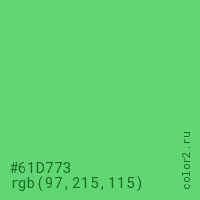 Цвет #61D773 в цветовой модели RGB обозначается тремя октетами (97, 215, 115) в десятичном формате и #61D773 в шестнадцатиричном (hex) формате, которые являются интенсивностью красного 97 (hex 61), интенсивность зелёного 215 (hex D7) и интенсивность синего 115 (hex 73).