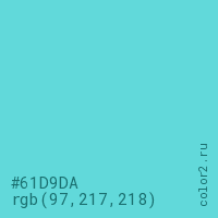 Цвет #61D9DA в цветовой модели RGB обозначается тремя октетами (97, 217, 218) в десятичном формате и #61D9DA в шестнадцатиричном (hex) формате, которые являются интенсивностью красного 97 (hex 61), интенсивность зелёного 217 (hex D9) и интенсивность синего 218 (hex DA).