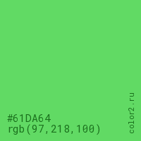 Цвет #61DA64 в цветовой модели RGB обозначается тремя октетами (97, 218, 100) в десятичном формате и #61DA64 в шестнадцатиричном (hex) формате, которые являются интенсивностью красного 97 (hex 61), интенсивность зелёного 218 (hex DA) и интенсивность синего 100 (hex 64).