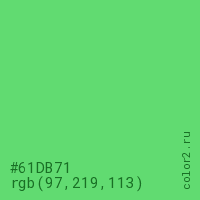 Цвет #61DB71 в цветовой модели RGB обозначается тремя октетами (97, 219, 113) в десятичном формате и #61DB71 в шестнадцатиричном (hex) формате, которые являются интенсивностью красного 97 (hex 61), интенсивность зелёного 219 (hex DB) и интенсивность синего 113 (hex 71).