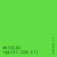 Цвет #61DC43 в цветовой модели RGB обозначается тремя октетами (97, 220, 67) в десятичном формате и #61DC43 в шестнадцатиричном (hex) формате, которые являются интенсивностью красного 97 (hex 61), интенсивность зелёного 220 (hex DC) и интенсивность синего 67 (hex 43).