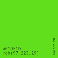 Цвет #61DF1D в цветовой модели RGB обозначается тремя октетами (97, 223, 29) в десятичном формате и #61DF1D в шестнадцатиричном (hex) формате, которые являются интенсивностью красного 97 (hex 61), интенсивность зелёного 223 (hex DF) и интенсивность синего 29 (hex 1D).