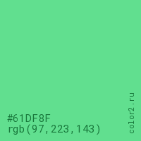 Цвет #61DF8F в цветовой модели RGB обозначается тремя октетами (97, 223, 143) в десятичном формате и #61DF8F в шестнадцатиричном (hex) формате, которые являются интенсивностью красного 97 (hex 61), интенсивность зелёного 223 (hex DF) и интенсивность синего 143 (hex 8F).