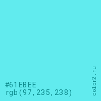 Цвет #61EBEE в цветовой модели RGB обозначается тремя октетами (97, 235, 238) в десятичном формате и #61EBEE в шестнадцатиричном (hex) формате, которые являются интенсивностью красного 97 (hex 61), интенсивность зелёного 235 (hex EB) и интенсивность синего 238 (hex EE).