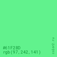 Цвет #61F28D в цветовой модели RGB обозначается тремя октетами (97, 242, 141) в десятичном формате и #61F28D в шестнадцатиричном (hex) формате, которые являются интенсивностью красного 97 (hex 61), интенсивность зелёного 242 (hex F2) и интенсивность синего 141 (hex 8D).