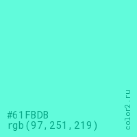 Цвет #61FBDB в цветовой модели RGB обозначается тремя октетами (97, 251, 219) в десятичном формате и #61FBDB в шестнадцатиричном (hex) формате, которые являются интенсивностью красного 97 (hex 61), интенсивность зелёного 251 (hex FB) и интенсивность синего 219 (hex DB).