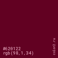 Цвет #620122 в цветовой модели RGB обозначается тремя октетами (98, 1, 34) в десятичном формате и #620122 в шестнадцатиричном (hex) формате, которые являются интенсивностью красного 98 (hex 62), интенсивность зелёного 1 (hex 01) и интенсивность синего 34 (hex 22).