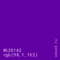Цвет #6201A2 в цветовой модели RGB обозначается тремя октетами (98, 1, 162) в десятичном формате и #6201A2 в шестнадцатиричном (hex) формате, которые являются интенсивностью красного 98 (hex 62), интенсивность зелёного 1 (hex 01) и интенсивность синего 162 (hex A2).